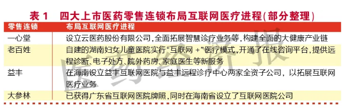 大型醫(yī)藥零售連鎖企業(yè)紛紛加入互聯(lián)網(wǎng)醫(yī)療布局陣營,以期化解處方來源及合理性、處方流轉(zhuǎn)等難題(如表1所示)。